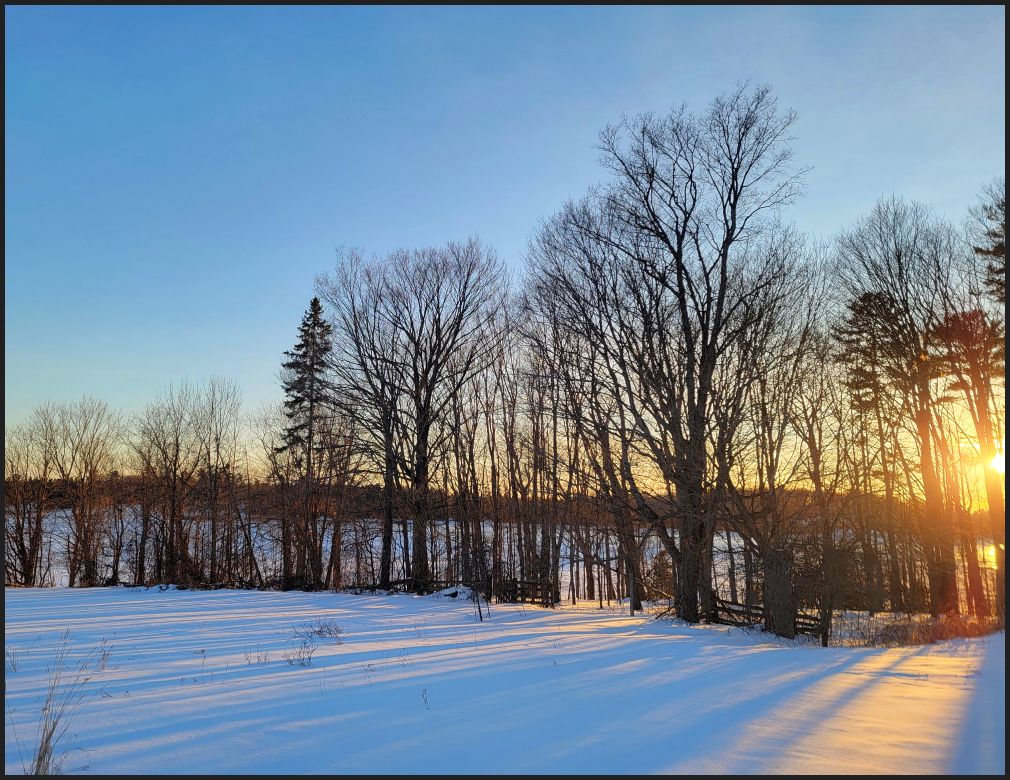 Thinking that we still have a chance to see an owl that a neighbour spotted here the night before, we also took the yellow trail. Once we crossed a small field, the trail took us through a mixed forest, to the shore of Pigeon Lake where we admired a shining sun setting over the vastness of white.