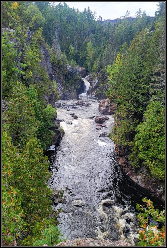 We could only imagine how large the waterfalls were before a dam was built here on the river in 1971. Still to this day, the 33-metre-high falls make a huge splash through multiple drops over the rugged red granite, making them one of the largest waterfalls in the Lake Huron watershed. The intricate rock steps of the granite fault channel the water into at least 25 individual chutes with several large cascading drops.